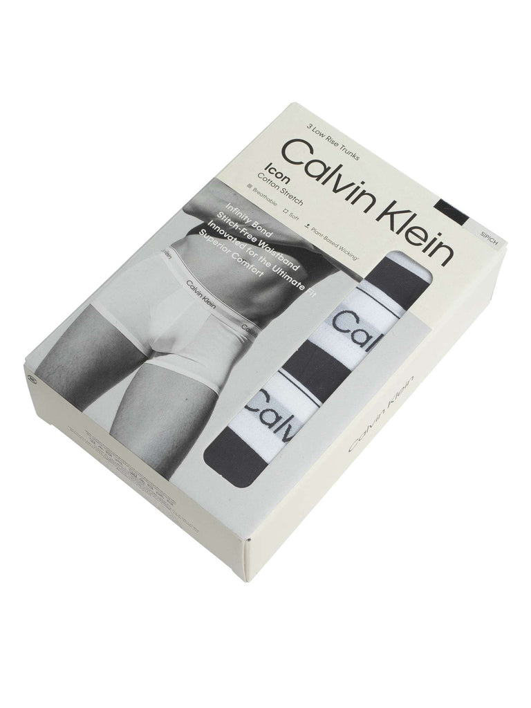 Stay cool, dry, and confident all day with the Calvin Klein ICON Cotton Stretch 3 Pack Icon Low Rise Trunks in classic black and white. Designed for a modern lifestyle, these trunks feature a stitch-free waistband for a smooth, irritation-free fit, ensuring maximum comfort no matter what your day holds.